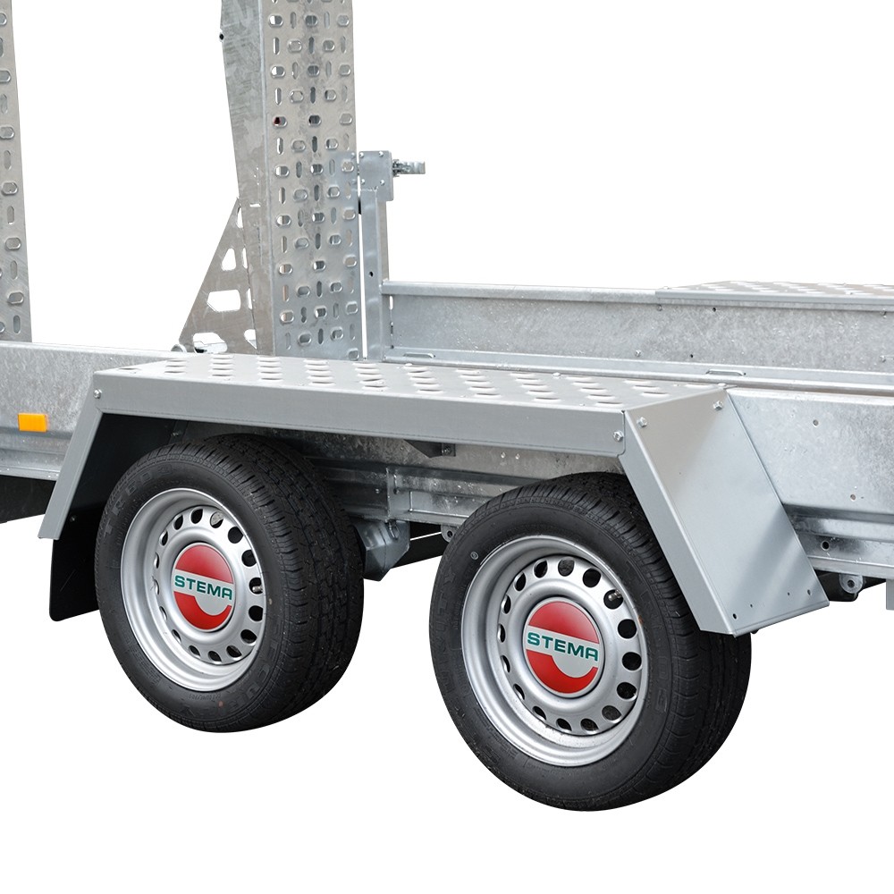 SERIENAUSSTATTUNGAuffahrrampen und -schächte2 Stahlrampen, seitlich verschiebbar (1 – 100 cm), mit zusätzlicherGasfeder als Hebehilfestabile Abstützung pro Rampemit sicheren SpannverschlüssenBordwand, Reling und Co.Vorder- und Seitenwände aus geschweißtem Schwarzblech20 cm hohe geschweißte Bordwändeoptional mit farbiger Pulverbeschichtung (Aufpreis je nach RAL)Fahrgestell und Rahmenoptimale Straßenlage durch teststreckengeprüftes Fahrgestell mitSTEMA Sicherheits-V-DeichselZugkugelkupplung mit Sicherheitsanzeigevoll feuerverzinktschraub-geschweißtes Fahrgestellgeschweißter und im Tauchbad feuerverzinkter Rahmen ausmassivem Stahlblech2 zusätzliche Längsträger gewährleisten die optimale LastenverteilungLadefläche und Bodendurchgängiger, rutschhemmender und wasserfesterSiebdruckholzboden18 mm starkoptional mit zusätzlichem ALU-Riffelblech-BodenLichttechnische Einrichtungenmoderne Multifunktionsbeleuchtungmit Rückfahrscheinwerfermit Nebelschlussleuchtemit Umrissleuchten für mehr Sicherheit13-poliger Stecker, EG-AusstattungRäder und Achsenrobuste Gummifederachse mit Einzelradaufhängungwartungsfreie Kompaktradlagerbegehbare Stahlblech-Kotflügel für das einfache Auf- und AbsteigenUnterlegkeile mit HalterungVerzurr- und SicherungsmöglichkeitenJe 4 geschweißte Verzurrschienen mit je 1000 daN (geprüft nach DIN75410-1) an den Seitenwänden auf der Ladefläche