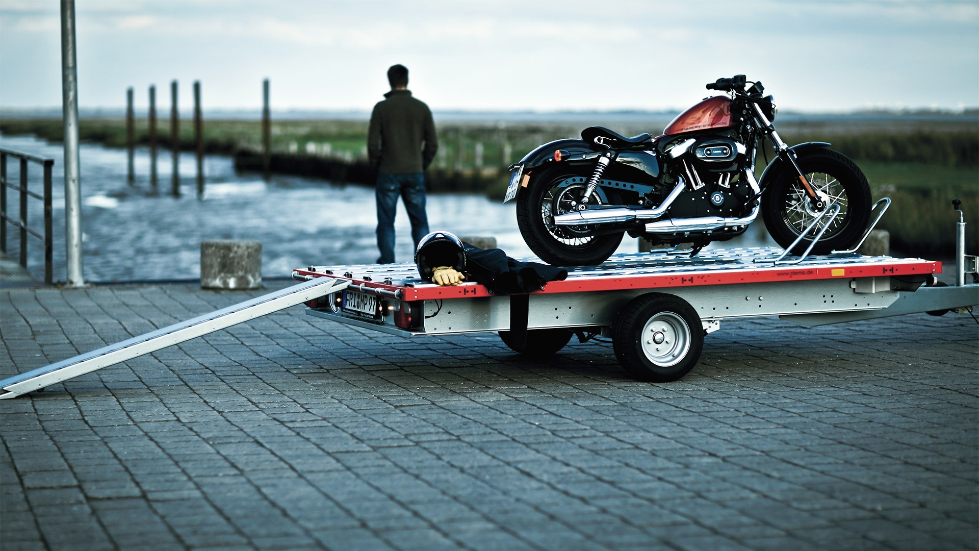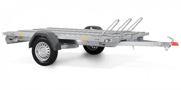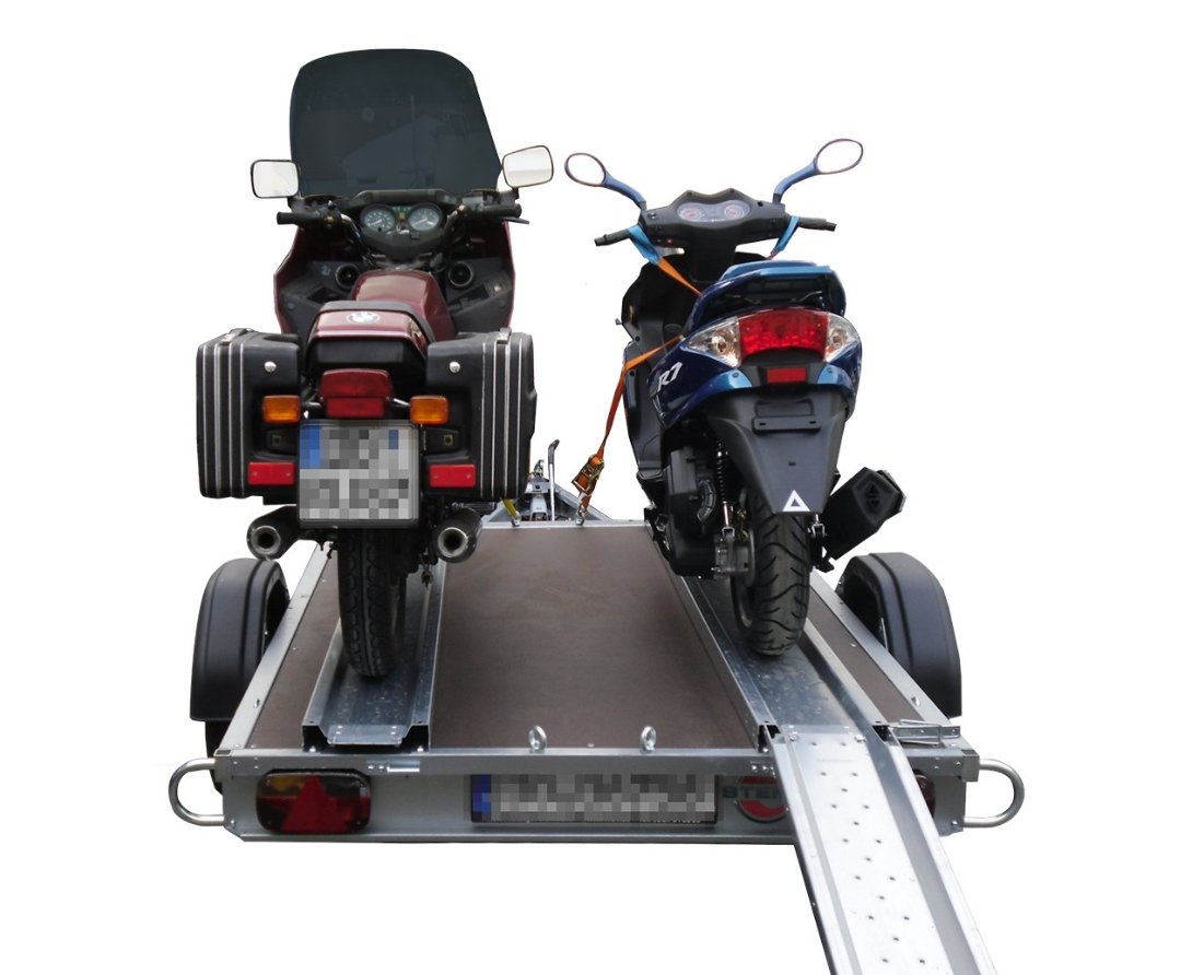 Der SySTEMA Motorradtransporter ist ein sehr stabiler Anhänger mit perfekter Nachlaufeigenschaft. Die durchgängigen Standschienen sind fest am Fahrzeugrahmen verankert und mit einer Vielzahl an Verzurrlöchern versehen, so dass Sie 1 bis 3 Motorräder flexibel abspannen und fixieren können. Die stabile Auffahrschiene ist clever hinter dem Kennzeichenträger verstaut. Diese Anhänger sind mit Hochplane erweiterbar, so sind die Bikes von oben gut gegen Regenwasser geschützt.